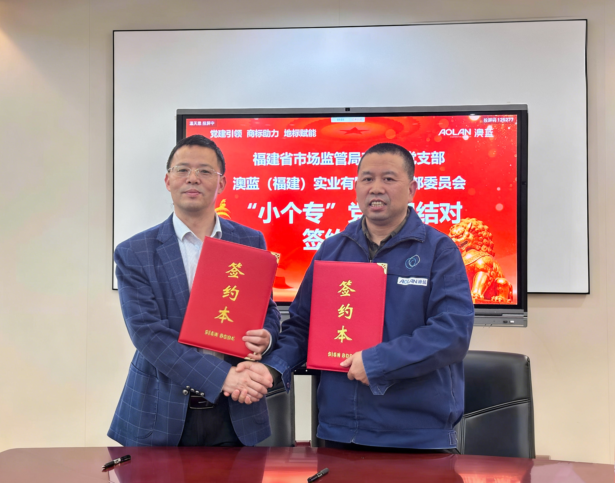 2026年3月27日,福建省市场监督管理局商标处党支部与澳蓝(福建)实业有限公司党支部“小个专”党组织结对共建活动在澳蓝公司顺利举行。本次活动以“党建引领、商标助力、地标赋能”为主题,政企双方以党建为纽带,深化知识产权领域协同服务。福建省市场监管局商标处副处长程飞(主持工作)、副处长林森媚、三级主任科员肖云出席活动,澳蓝总经理助理、党支部书记兰锦声带领公司党员代表参加本次共建。